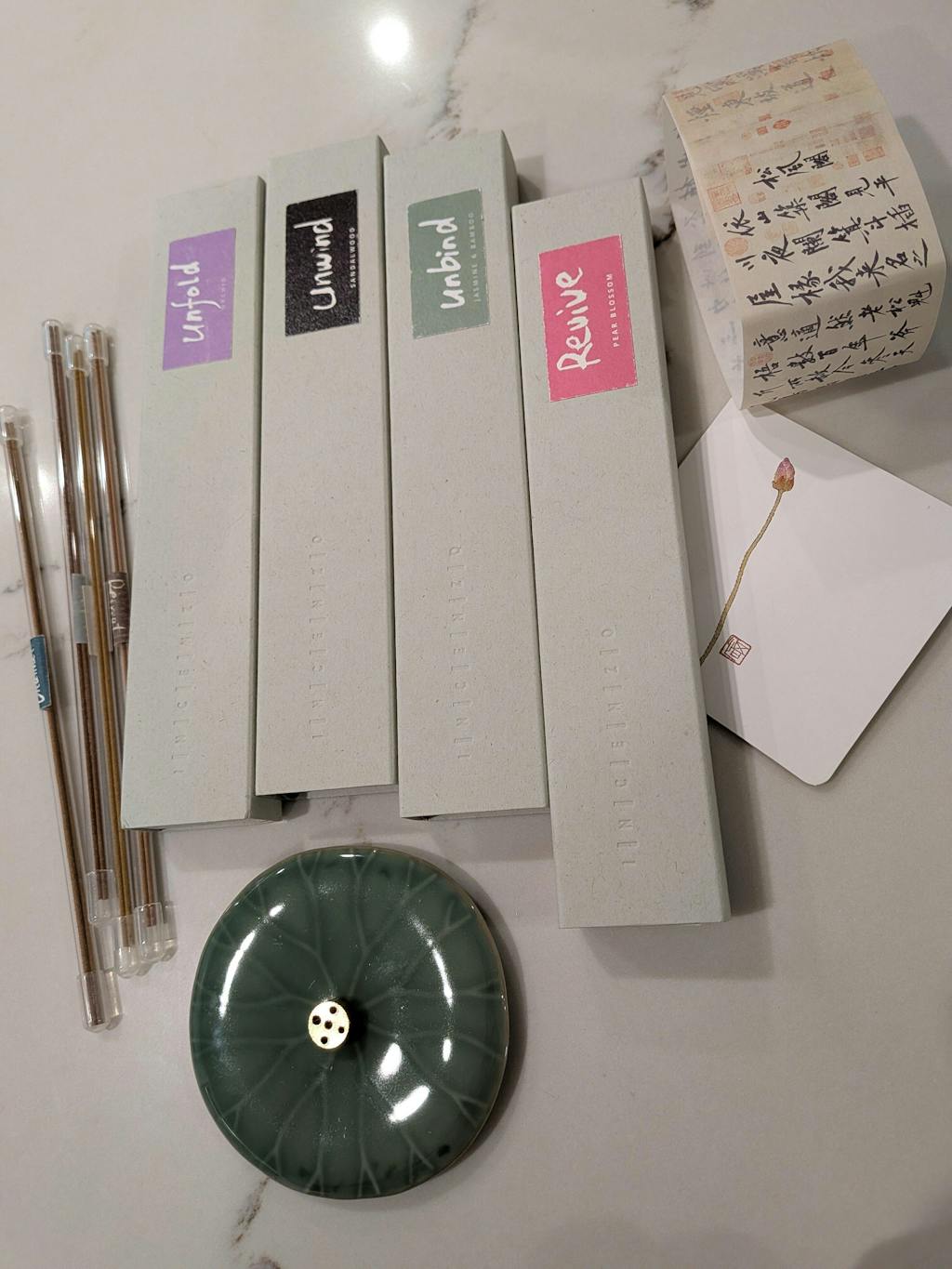 Each package includes a portable incense holder, designed especially for first-time users. While we've rigorously tested its safety, we recommend using it cautiously and always keeping it within sight, as it is made from paper.